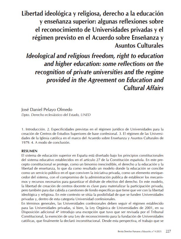 Libertad ideológica y religiosa, derecho a la educación y enseñanza superior: algunas reflexiones sobre el reconocimiento de Universidades privadas y el régimen previsto en el Acuerdo sobre Enseñanza y Asuntos Culturales